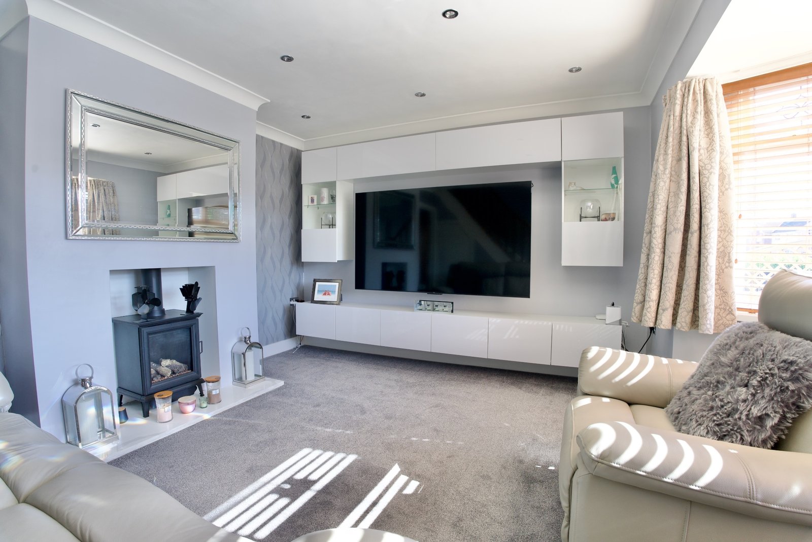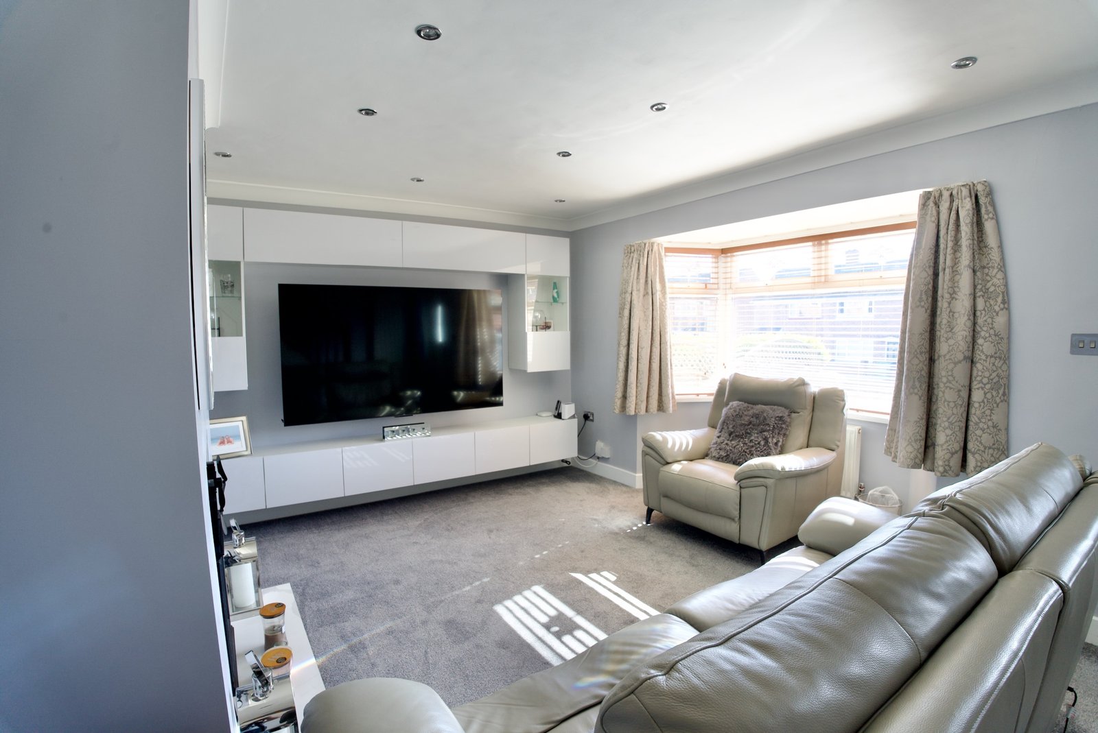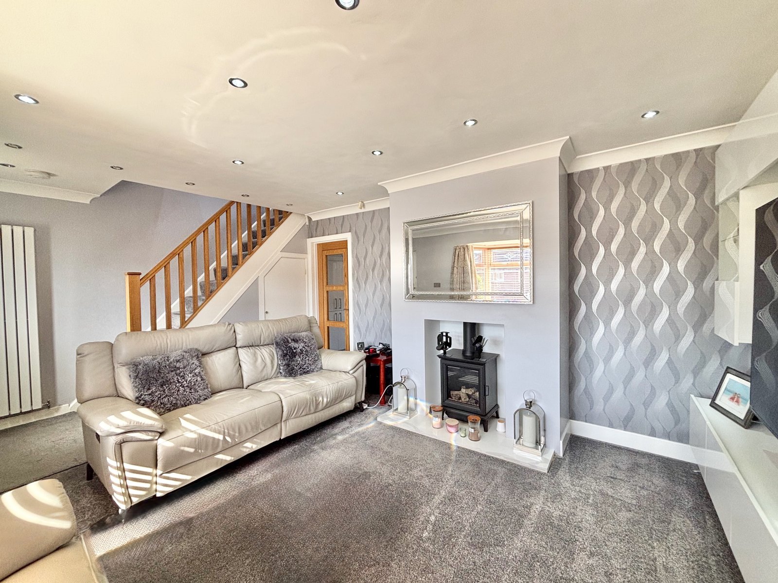 To the front, the property boasts a fully paved garden, designed for low maintenance while providing an attractive first impression. Upon entering, you are welcomed into a bright and contemporary living room, featuring a striking modern media wall, a charming bay window, and an elegant oak open-plan staircase that adds a real sense of character.
