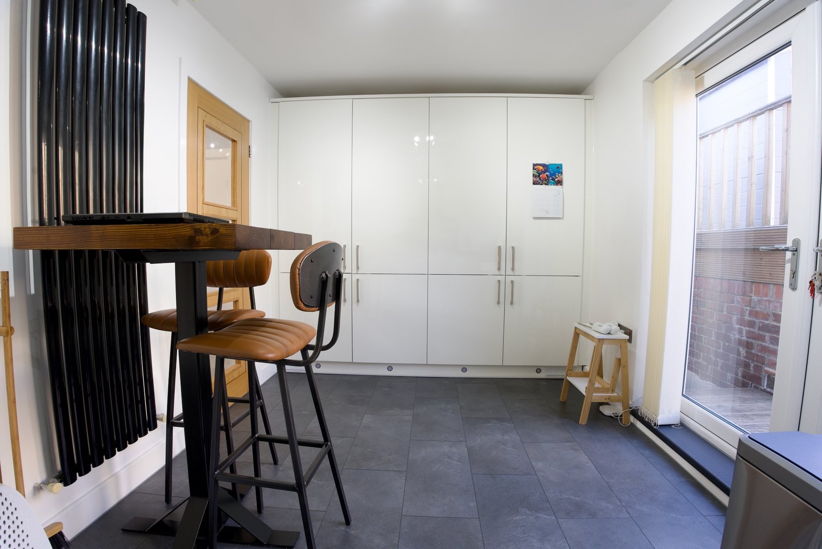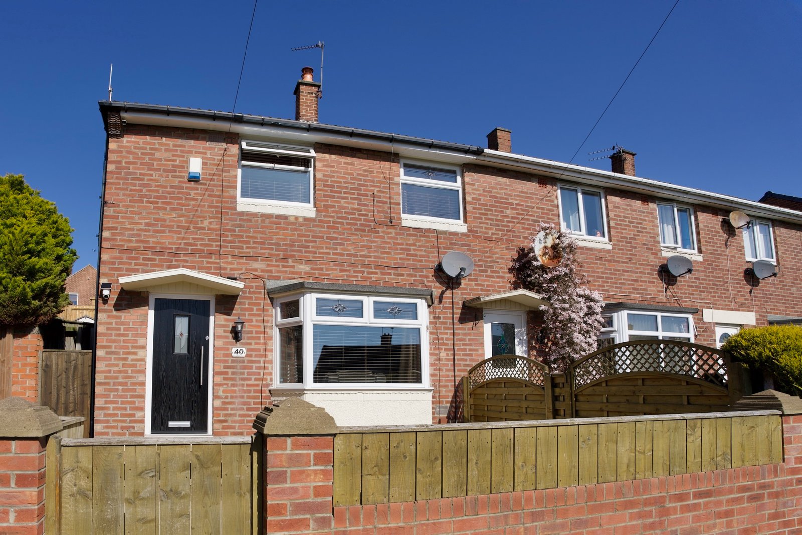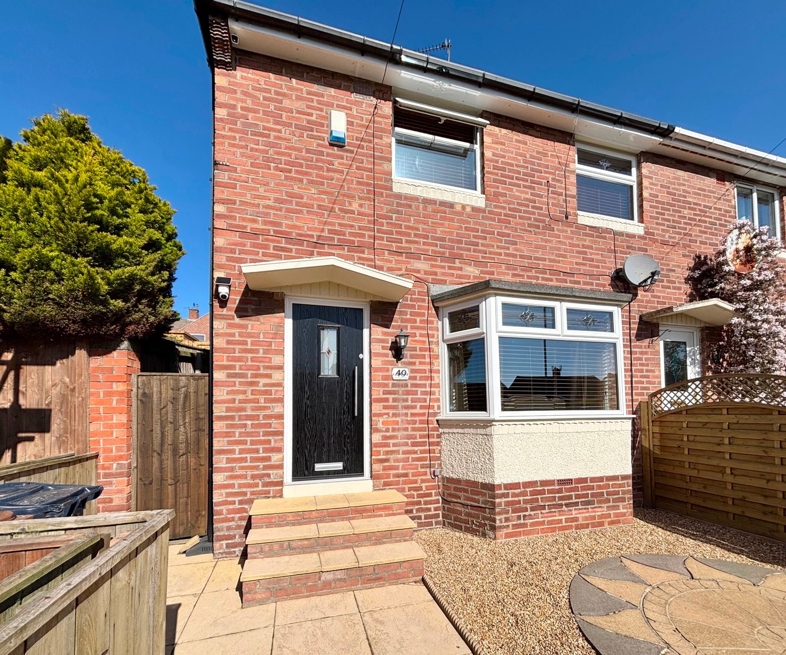To the front, the property boasts a fully paved garden, designed for low maintenance while providing an attractive first impression. Upon entering, you are welcomed into a bright and contemporary living room, featuring a striking modern media wall, a charming bay window, and an elegant oak open-plan staircase that adds a real sense of character.