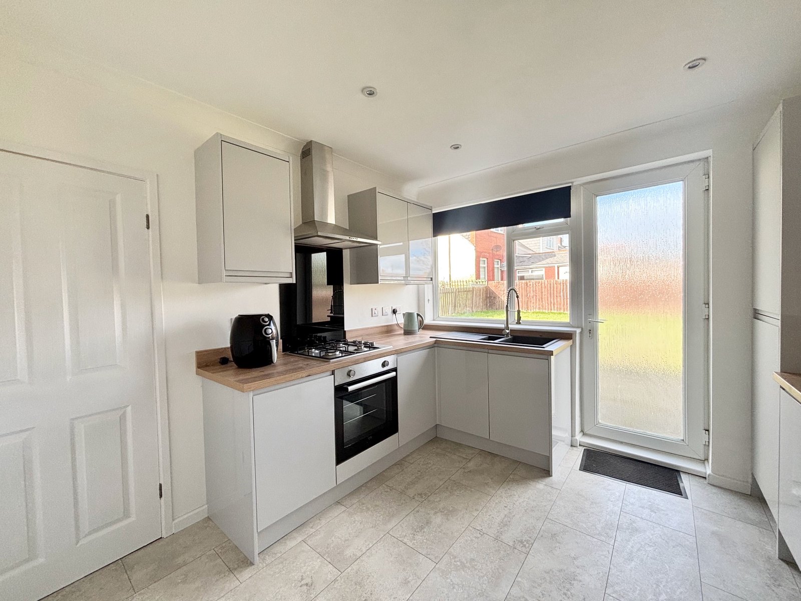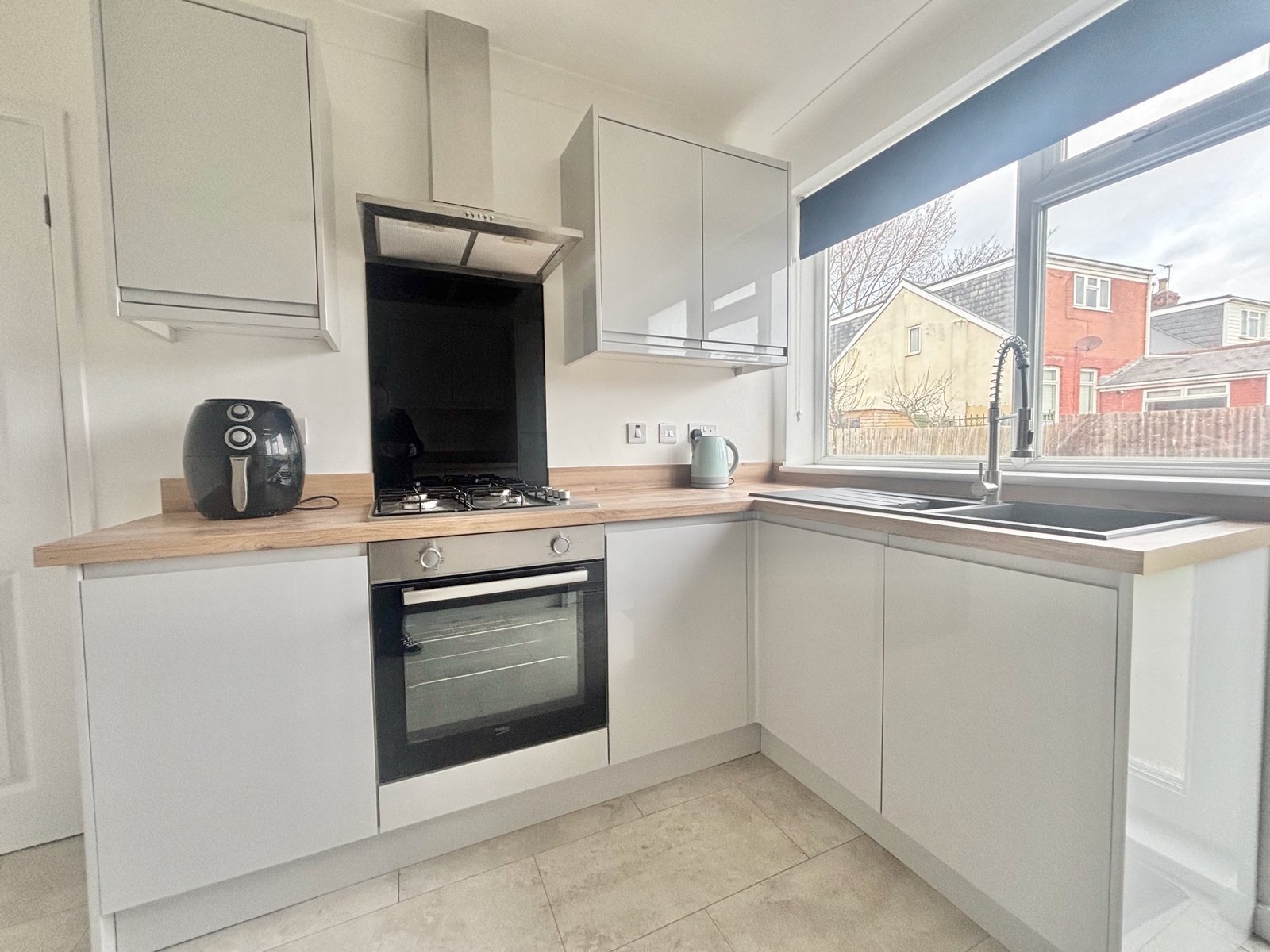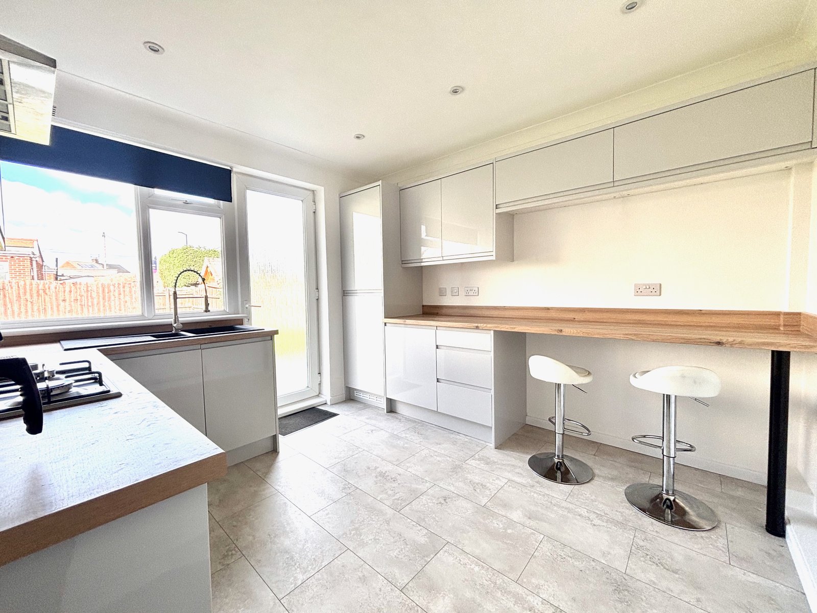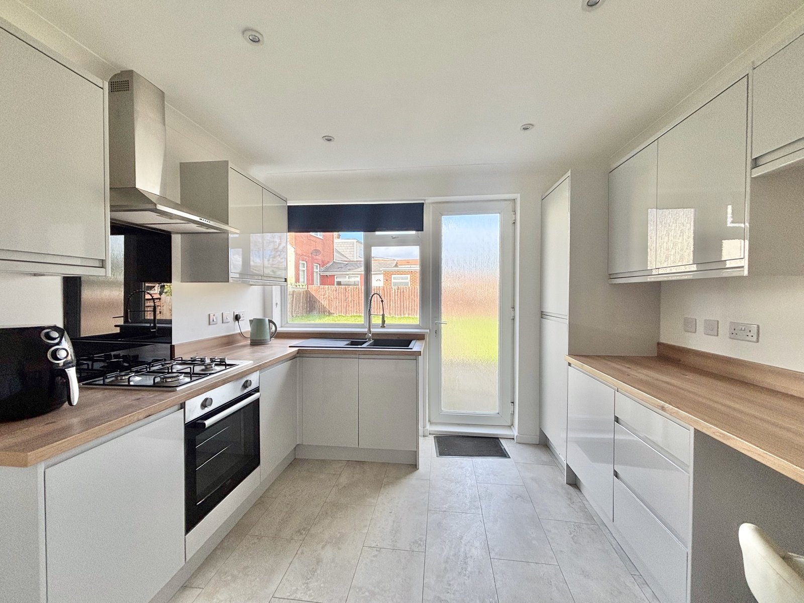 The newly fitted kitchen has been thoughtfully designed and comes complete with integrated fridge, freezer, and washing machine, providing a modern and practical cooking area.