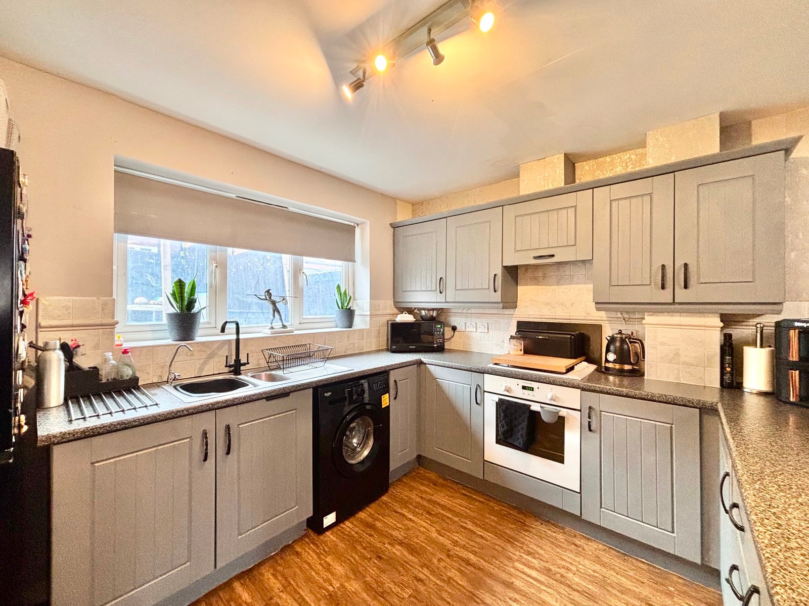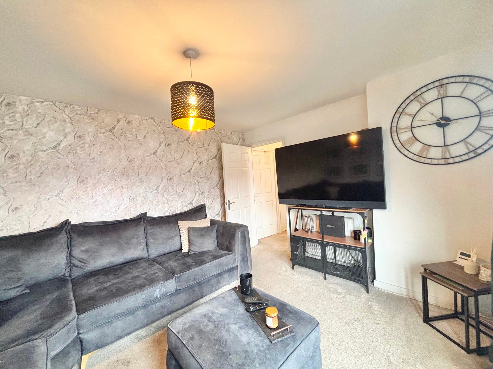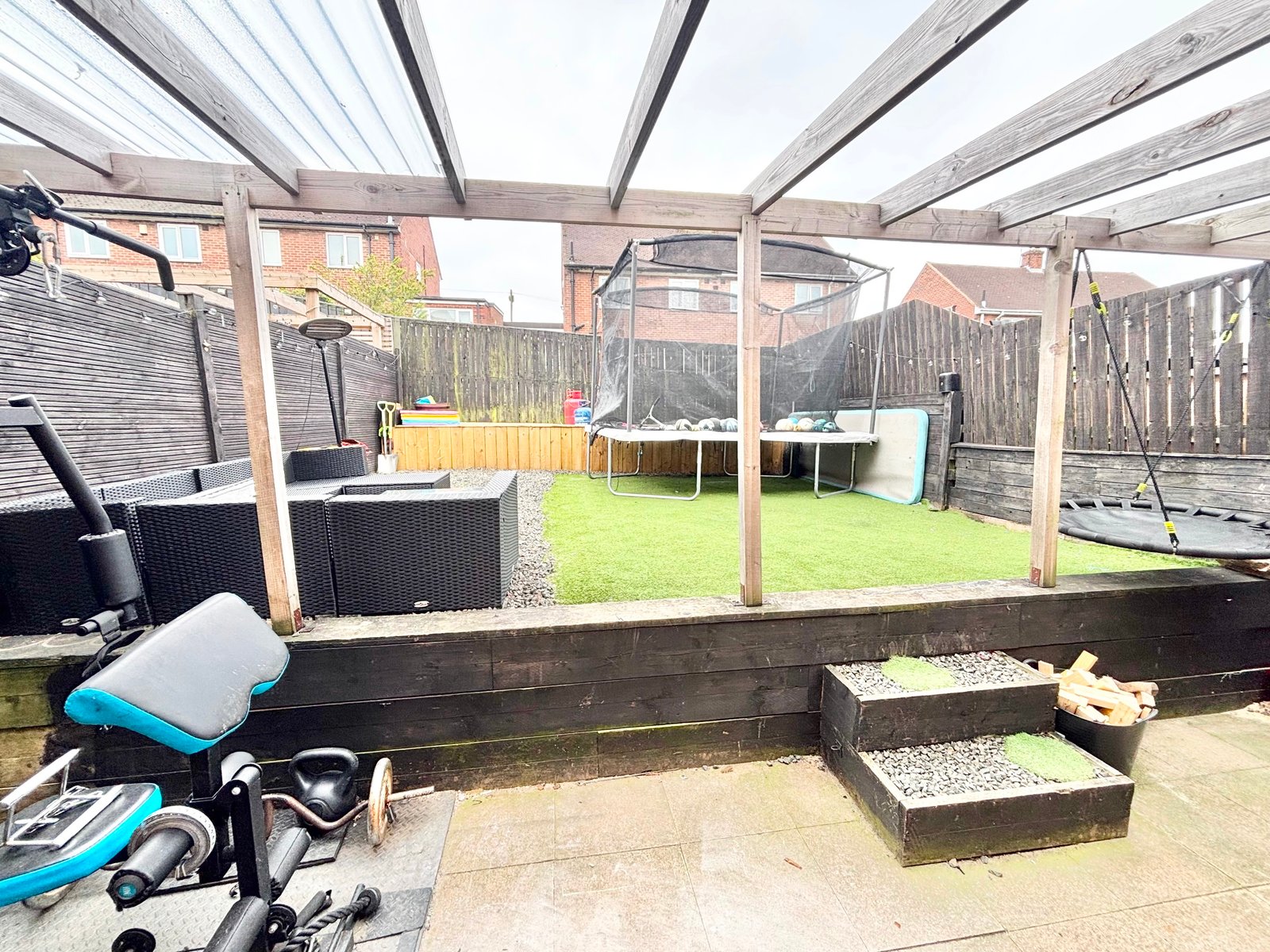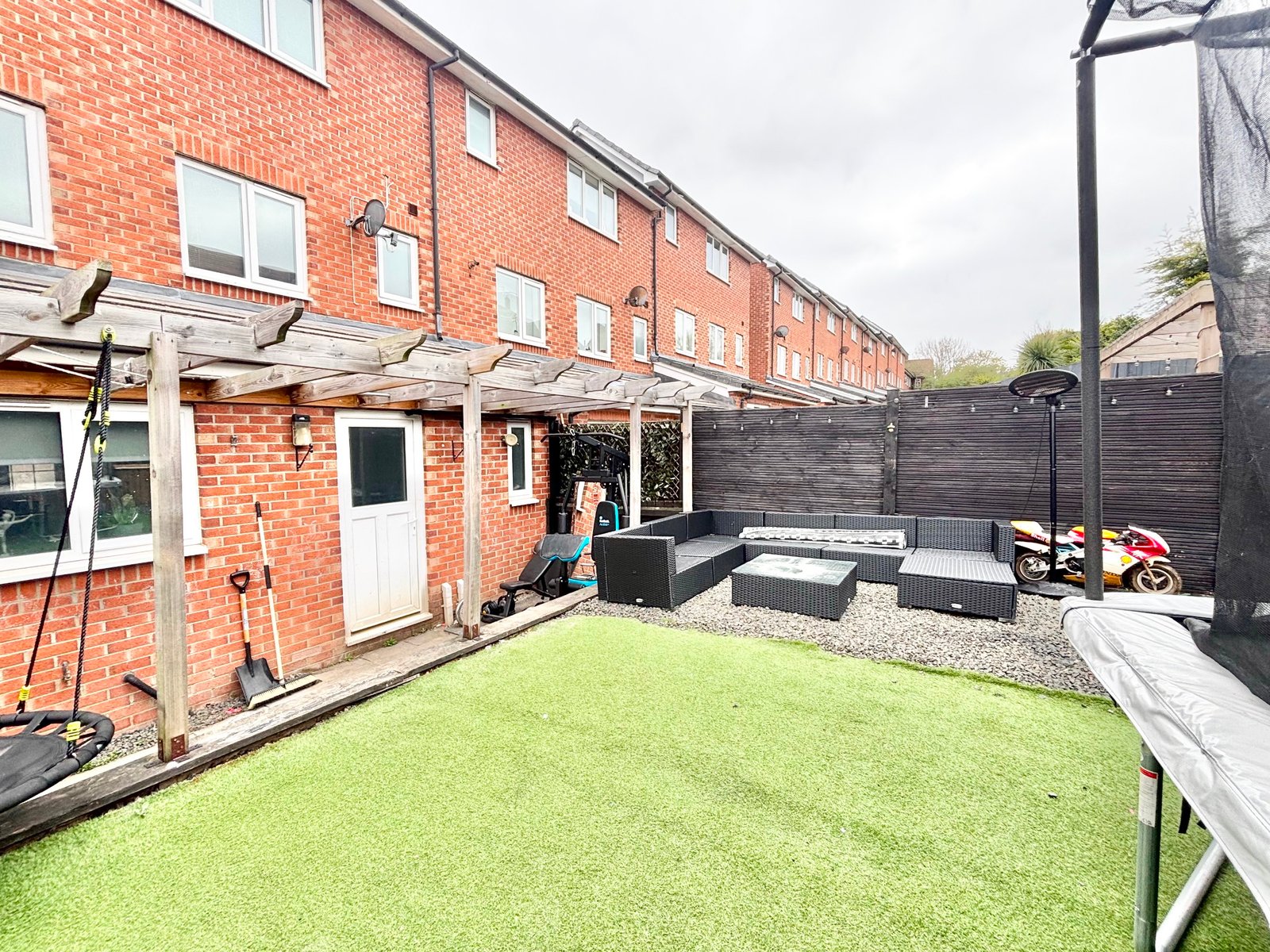 Externally, the rear garden has been landscaped for both style and ease of maintenance, featuring a contemporary lean-to pergola, a paved patio area ideal for outdoor dining, and an artificial lawn for year-round enjoyment.