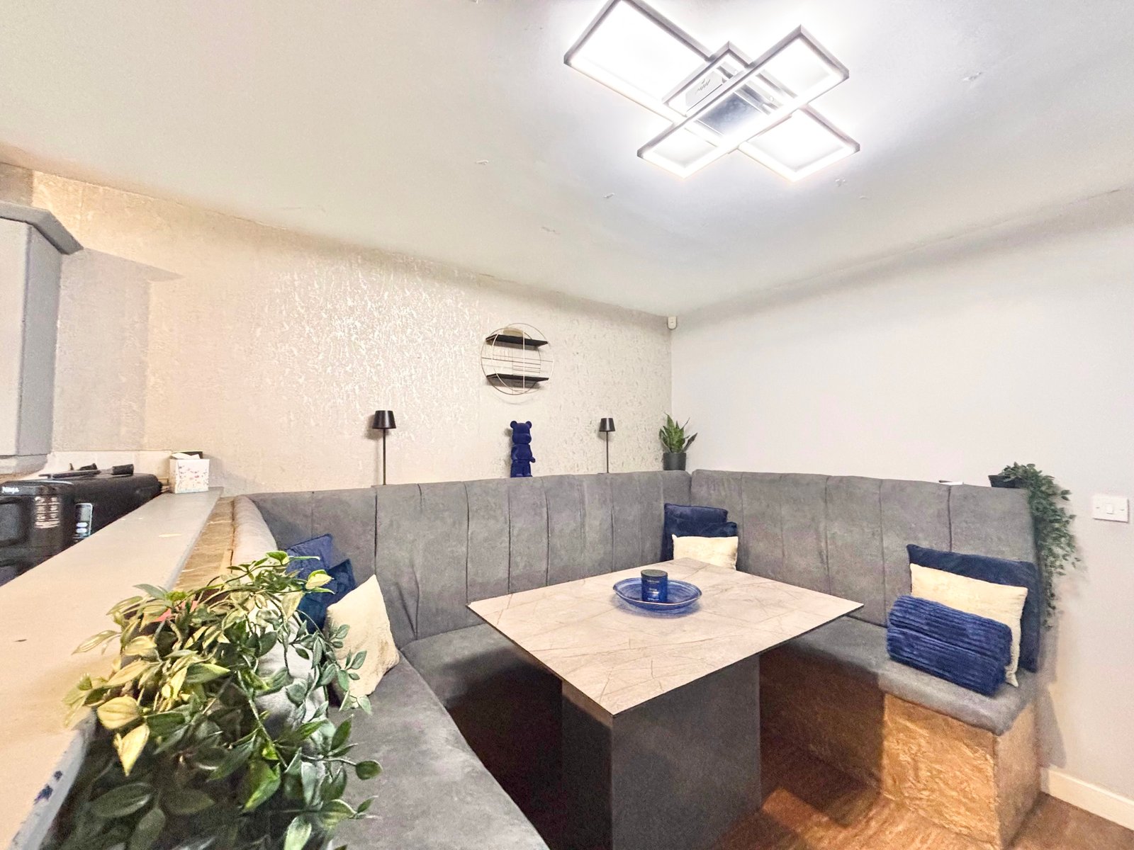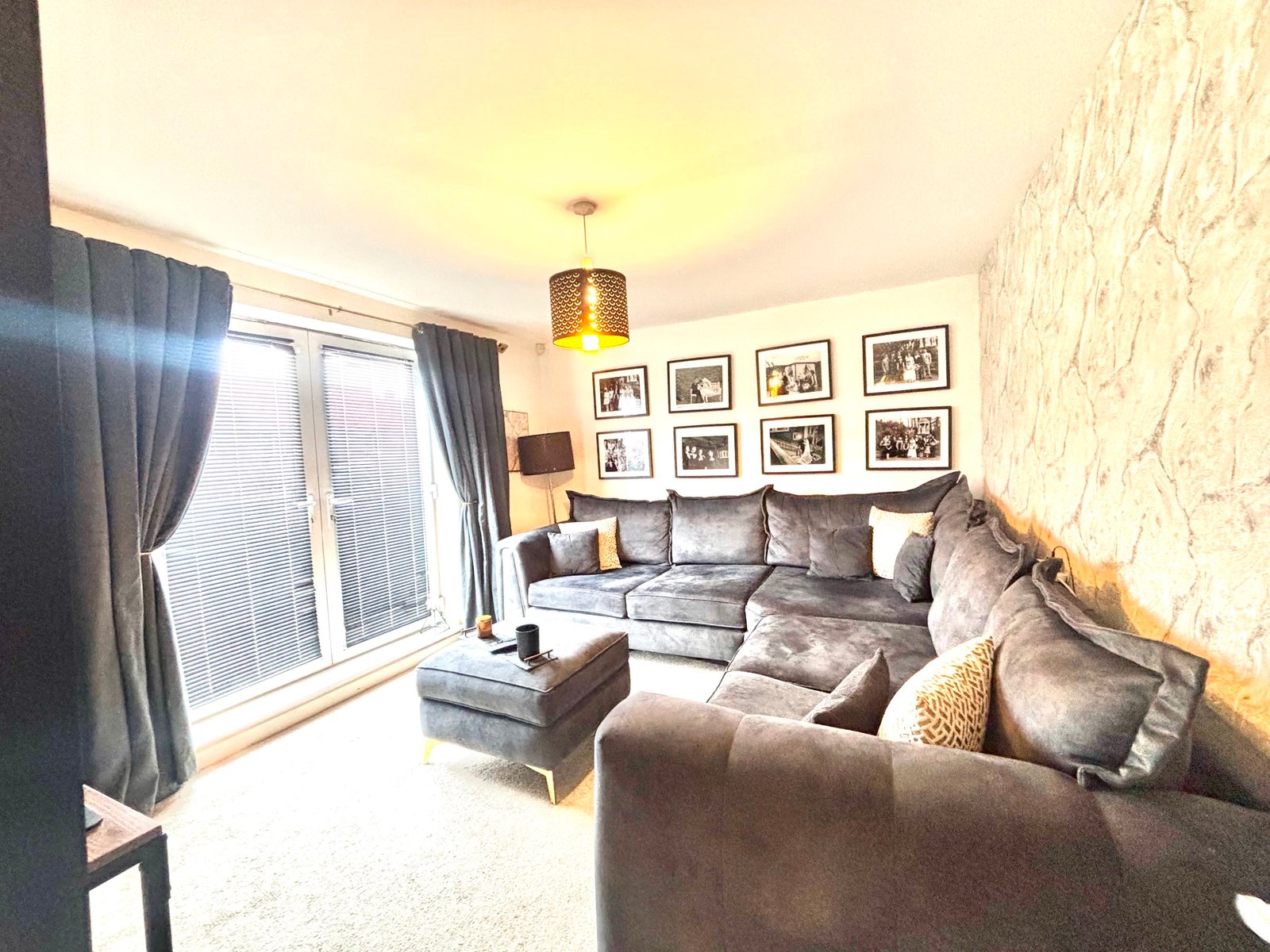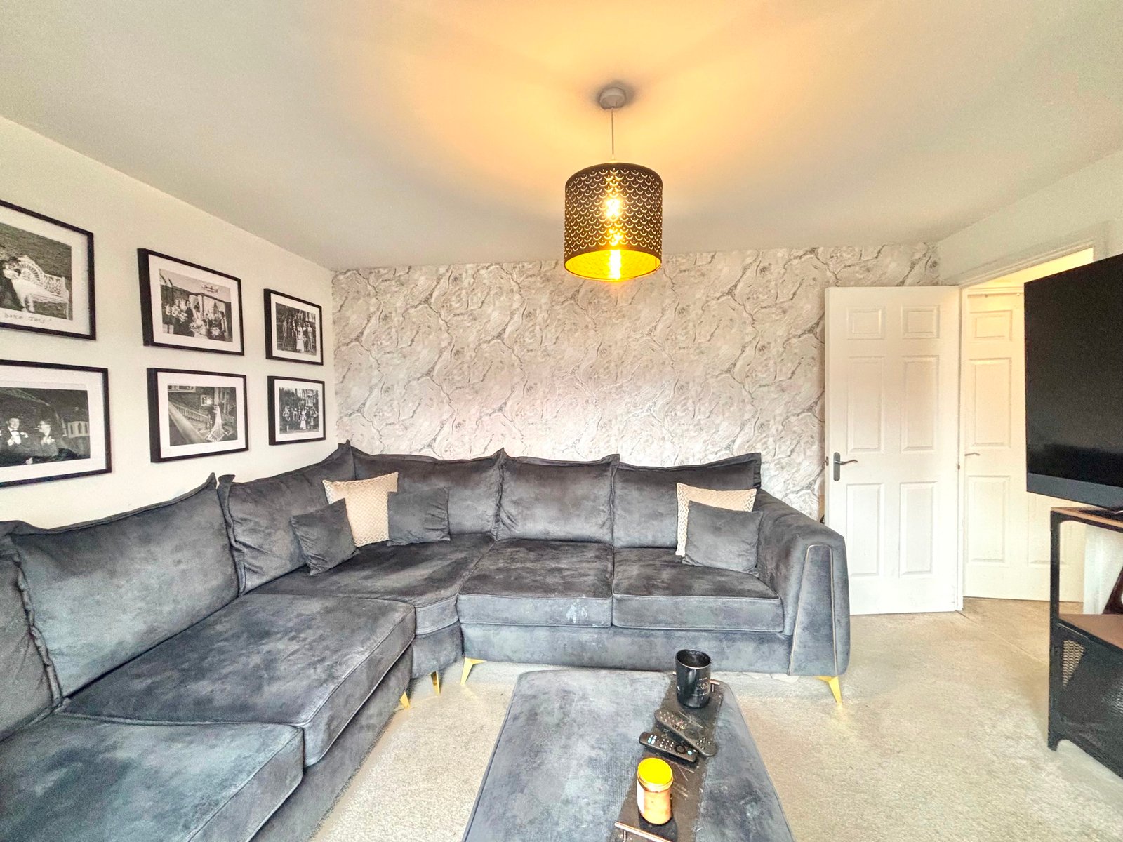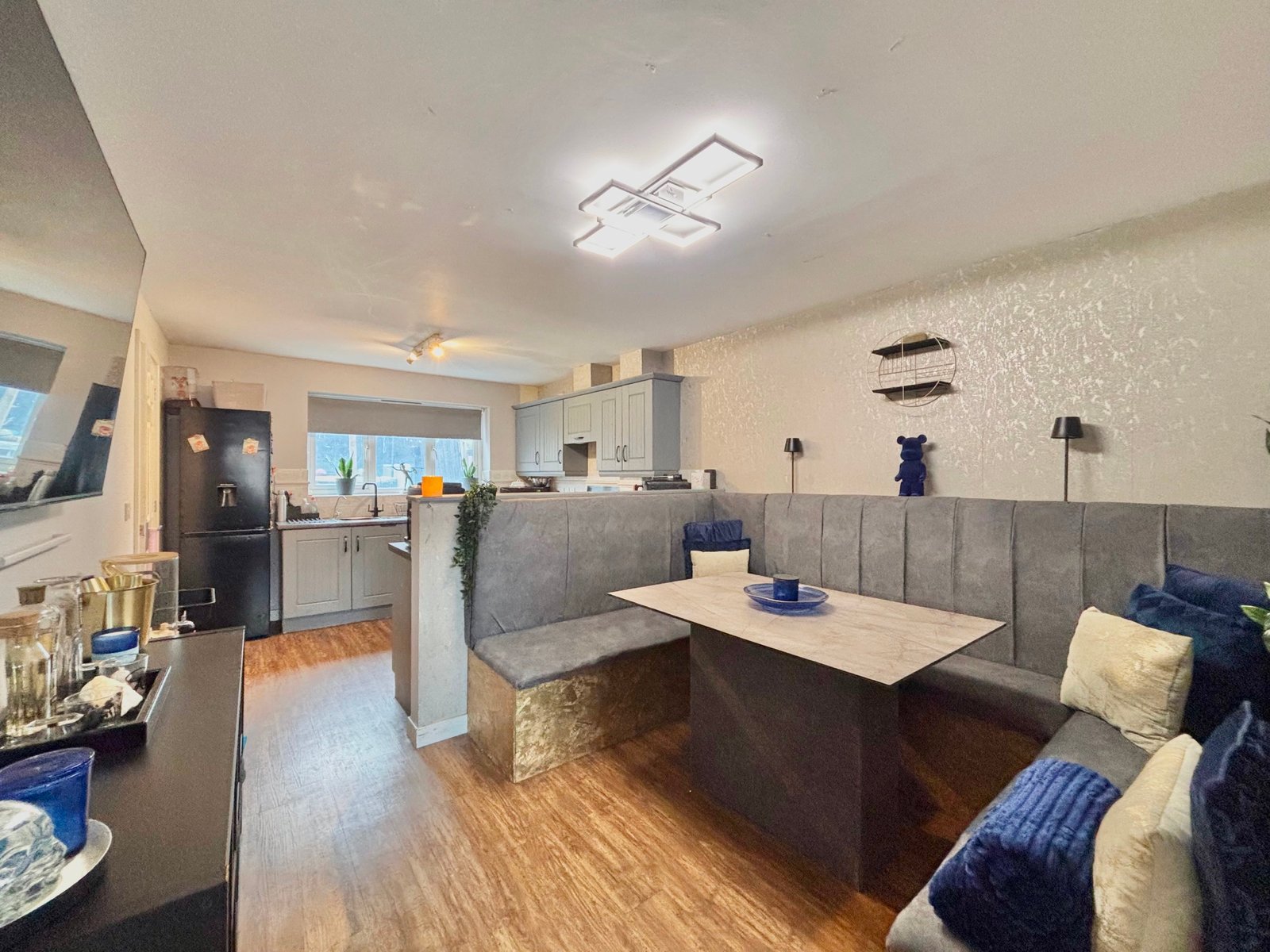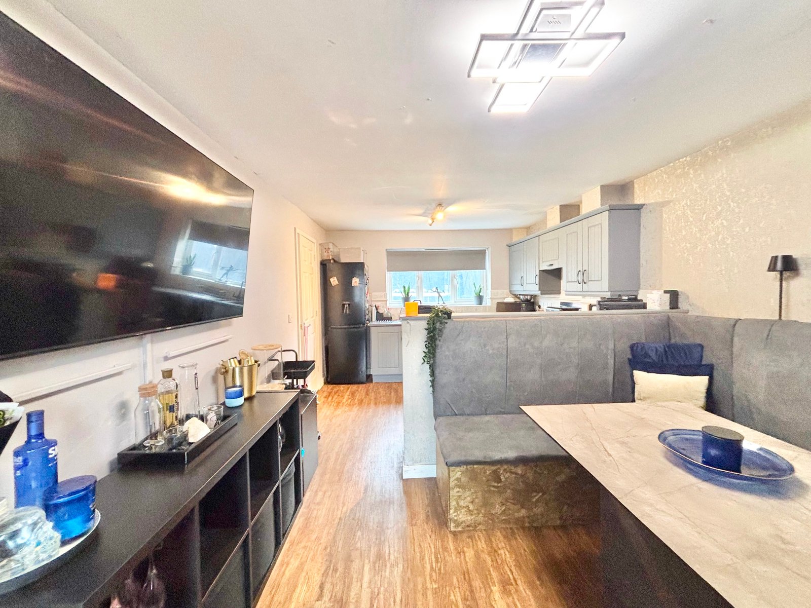Externally, the rear garden has been landscaped for both style and ease of maintenance, featuring a contemporary lean-to pergola, a paved patio area ideal for outdoor dining, and an artificial lawn for year-round enjoyment.