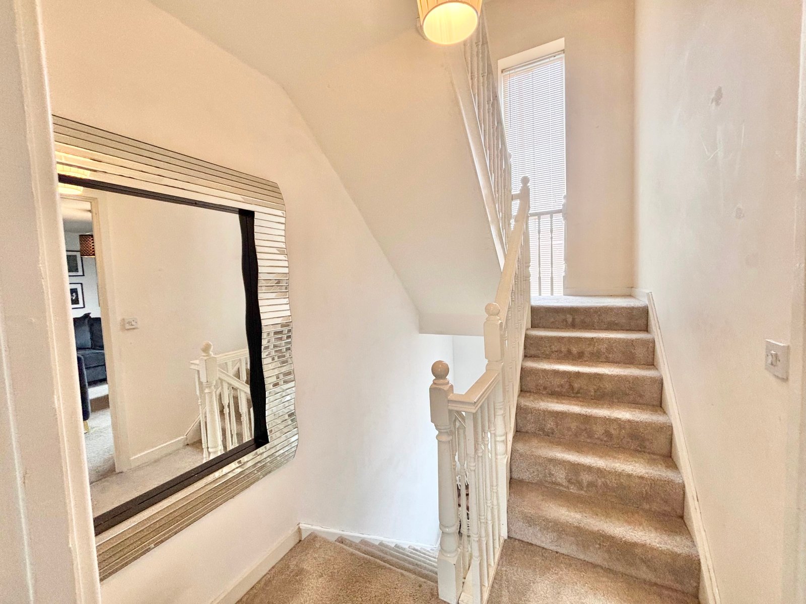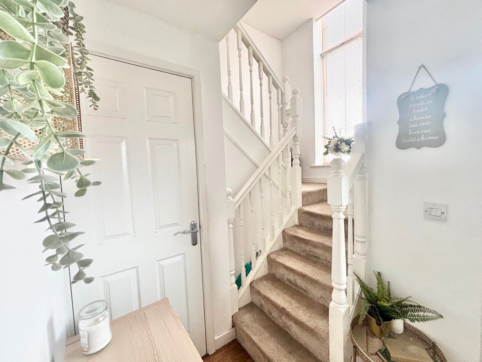 A standout architectural feature is the striking stairwell, enhanced by a full-height window extending from ground to third floor, bathing the interior in natural light.